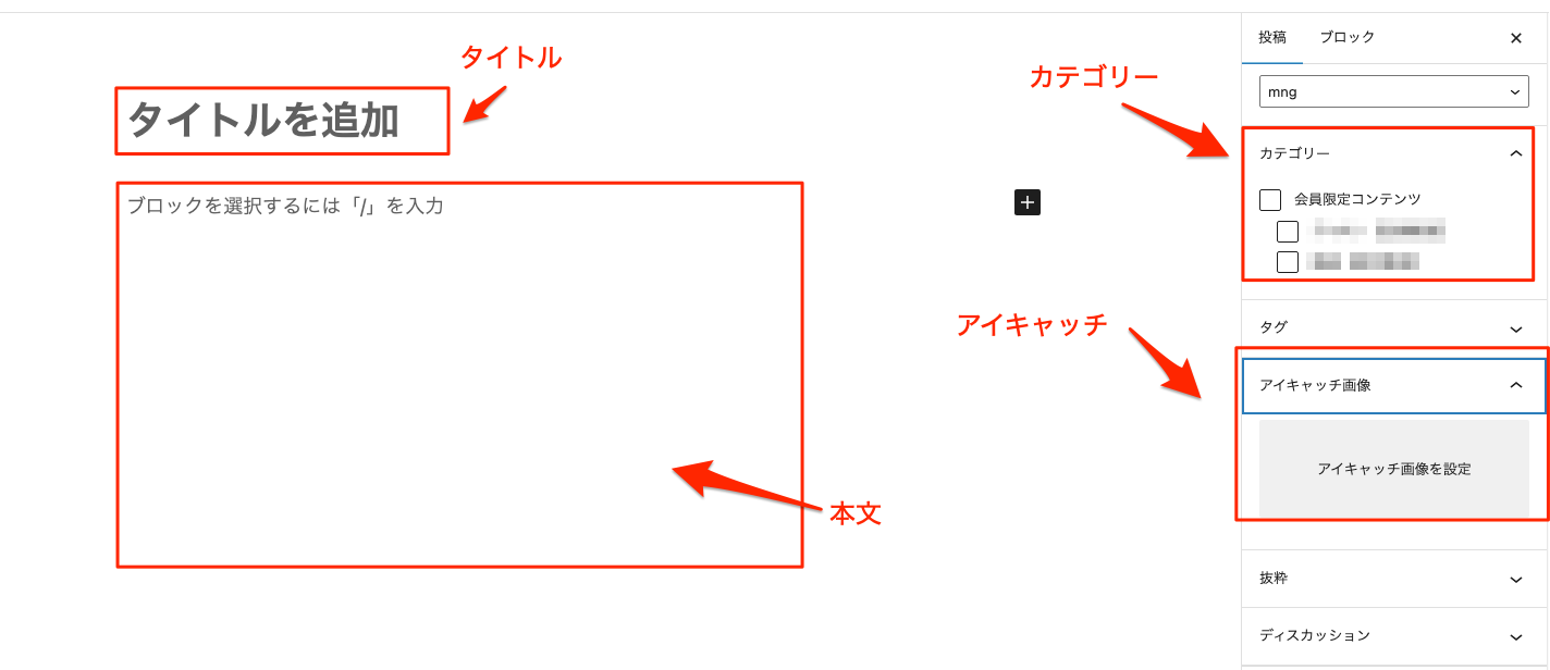 タイトル、本文、カテゴリー、アイキャッチに登録した内容は上図のように表示されます。